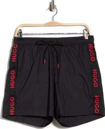 Sporty logo tape runs down the sides of these lightweight quick-drying swim trunks finished with handy pockets.