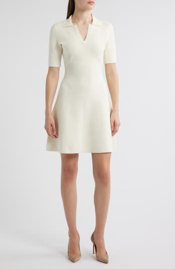 Extend sweater dress season with a short-sleeved option topped with a jaunty collar and knit in a fit-and-flare silhouette.
