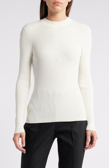 Expand your wardrobe options with this sweater knit in a trim-fitting rib stitch and topped with a sleek mock neck.