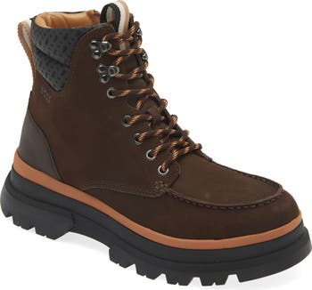 A grippy lug sole with deep flex grooves stabilizes your stride in a lace-up boot crafted from polished leather with a side-zip closure.