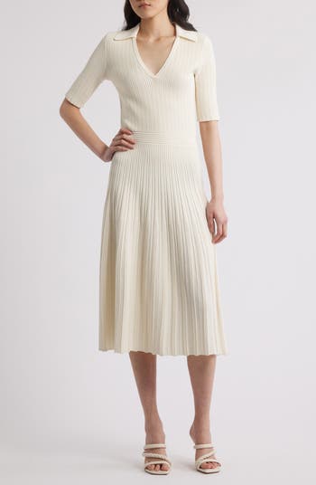 Allover ribbing textures and shapes this polished midi designed with a fitted, collared bodice and finished with a flared skirt that sways with every step.