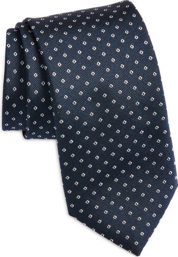 A geometric pattern brings texture and distinction to a handsome silk-blend tie that complements formal and semiformal attire.