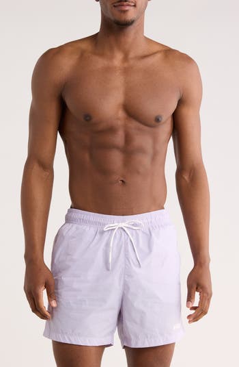 Logo lettering lends signature charm to lightweight, quick-drying swim trunks sporting handy pockets for stowing essentials when you're on land.