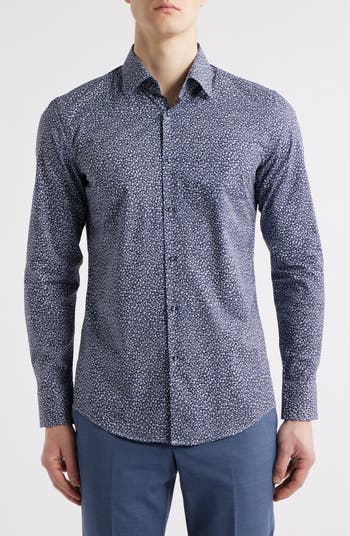 Tailored from stretch-enhanced cotton in a neat floral print, this crisp dress shirt with adjustable cuffs is the perfect fit for your work wardrobe.