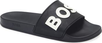 A rubberized block-letter logo tops the wide vamp of a pool-ready slide sandal crafted in Italy.