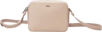 Gleaming logo hardware stands out against sleek faux leather on a structured crossbody bag designed with an adjustable strap perfect for on-the-go styling.