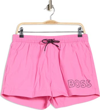 Logo lettering brands the left pant of these quick-drying swim trunks styled with handy pockets.