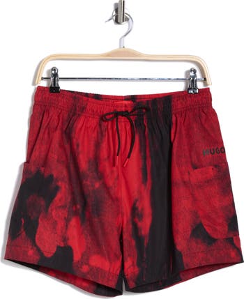 Colorful patterns enliven these quick-drying swim trunks built from stretchy tech fabric.