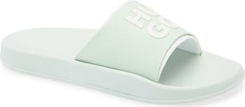 A dimensional logo distinguishes the wide vamp strap atop a casual slide sandal built with a lightly cushioned footbed for comfort and support.