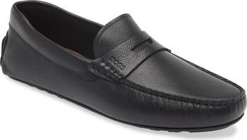 Soft, grainy leather and a grippy rubber sole distinguish this premium driving shoe with a debossed logo at the strap for subtle branding.