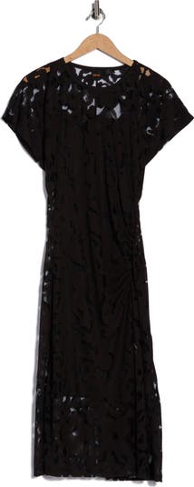 A floral pattern sweetens the look of this semi-sheer T-shirt dress lined with a coordinating slip.
