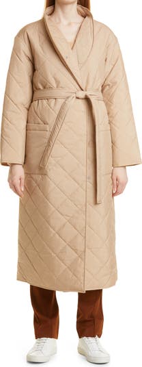 Tasteful box quilting lends stylish and gentle texture to an effortless coat that looks great open or with its matching belt tied around the waist.