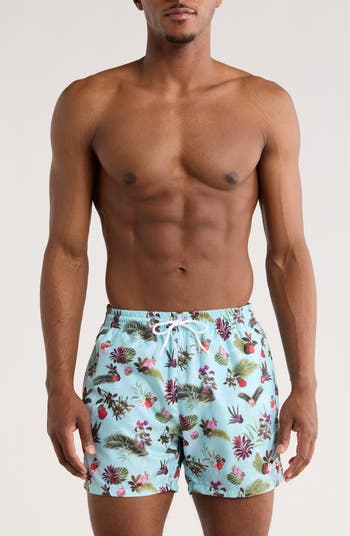 A shorter inseam allows you to soak up more of the sun in these swim shorts covered in a tropical print.