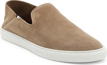 A collapsible back heel enhances the easy-wear comfort of this soft suede slip-on sneaker grounded by a white rubber sole.