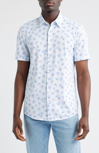 Allover flowers add dapper distinction to this short-sleeve button-up shirt cut from comfortable, lightweight stretch cotton in a slim fit.