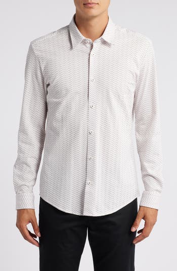 Made from a lightweight, cotton-rich blend with a fine zigzagging print, this long-sleeve button-up shirt is perfect for work or the weekend.