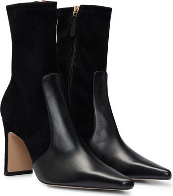 A pointy toe and narrow heel balance a sleek leather bootie fashioned with a side zipper for easy entry.