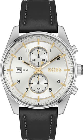 Dual subdials and a streamlined silhouette enrich a sophisticated chronograph watch housed on a classic leather strap.
