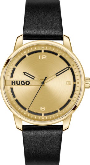 Show off sophisticated shine with this black leather-strap watch boasting a brushed sunray dial with precise three-hand movement.