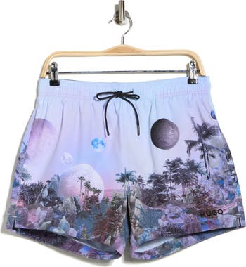 A photorealistic nature print covers these lightweight quick-drying swim trunks designed with handy pockets.