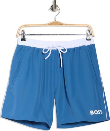 Contrast piping lends a retro touch to these supremely stretchy swim trunks boasting a logo near the hem.