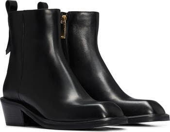 Subtle polished hardware shines brightly from the smooth leather profile of this block-heel bootie modernized by a sleek, squared toe.