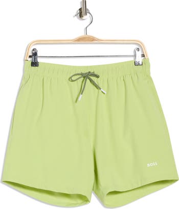 Logo lettering lends signature charm to lightweight, quick-drying swim trunks sporting handy pockets for stowing essentials when you're on land.