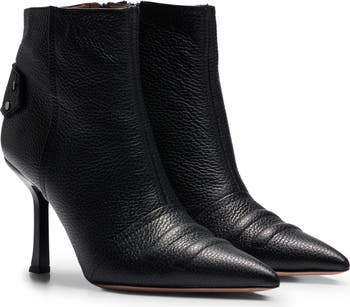 A slightly slouchy shaft lends modern appeal to a trend-savvy bootie balanced by a pointy toe and slender heel.