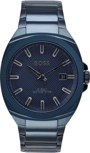 Bold markers and a convenient date window stand out on the textured dial of this classically sophisticated watch fitted with a polished bracelet.