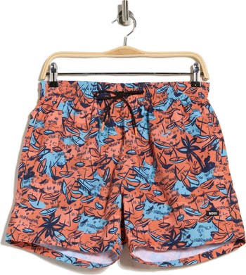 Vibrantly printed fabric and a stretch liner keeps you moving comfortably in and out of the water in volley-length swim trunks.