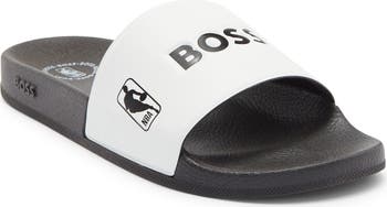 Head to the locker room or lounge after practice in this easy-wear slide sandal featuring an official NBA logo, foam-cushioned footbed and flat rubber sole.