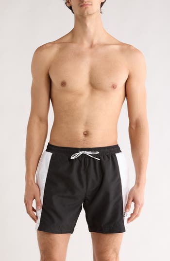 Contemporary colorblocking enlivens these quick-drying swim trunks built from stretchy tech fabric.