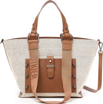 The brand's logo defines the webbed straps that top a convertible tote bag that's structured with a sized-down interior