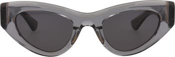 Bold, statement hardware gleams along the arms of designer sunglasses featuring a dramatic cat-eye silhouette and UV-shielding lenses.