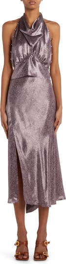 A swirling print patterns the fluid, high-shine cupro twill of this slinky halter dress with elegant draping and tiny silvertone beads adding extra shine.