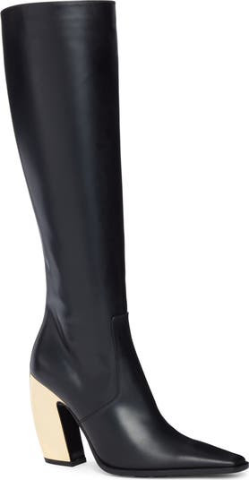 An angled-off pointy toe adds to the sharp, sleek look of this runway-featured Western-inspired boot lifted on a signature heel wrapped in gleaming metal.