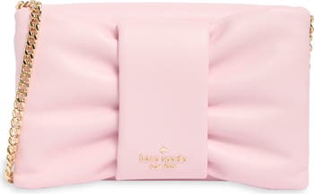 Gleaming logo hardware and a ruched bow design distinguish a smooth leather crossbody bag fitted with a gleaming chain strap for hands-free wear.