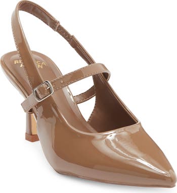 A pointed toe and slim heel balance a sleek patent pump fashioned with a svelte slingback strap for a secure fit.