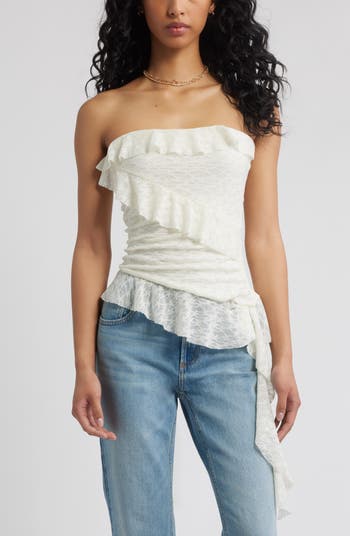 An asymmetric hemline and cascading ruffle that wraps up along the body double down the Y2K inspiration of this lacy tube top.
