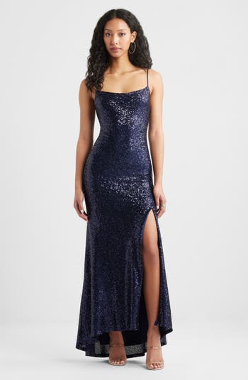Catch the light from every angle in this dazzling sequin dress made more memorable with an open back crisscrossed in slinky ties. An extended side slit eases every step from dinner to dance floor.