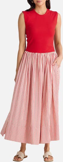 A close-fitting knit bodice juxtaposes the voluminous poplin skirt on this sleeveless maxi designed with leg-baring side slits for easy movement.