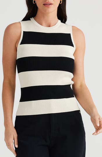 Bold stripes encircle a lightweight sleeveless sweater that's ribbed to hug your shape.
