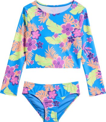 Your kiddo can enjoy the surf and sand in this protective set featuring a floral long-sleeve rashguaed and matching bikini bottoms.