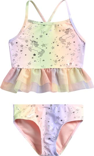 Beach days are more magical in an ombré swimsuit fixed with mesh ruffles and featuring a friendly unicorn.
