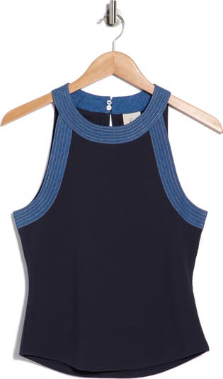 This tank is finished with stitched contrast denim along the trim, adding a subtle, modern edge to a clean, streamlined silhouette.