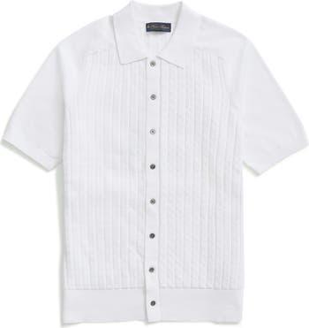 Mother-of-pearl buttons punctuate a fine-gauge cotton polo-sweater that's neatly cable-stitched and flanked by saddle sleeves sleeves for retro panache.