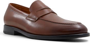 A precisely carved penny keeper lends timeless distinction to a leather loafer framed with a stacked heel and an apron toe.