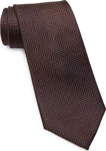 Elevate your wardrobe with this herringbone-patterned silk tie showcasing classic brown and navy hues.