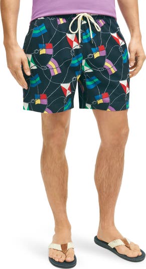 Make a splash in colorful swim trunks constructed with a comfortable elastic-drawstring waistband and convenient pockets.