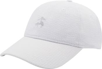 Logo embroidery marks the crown of this summerweight baseball cap made from breezy seersucker cotton.